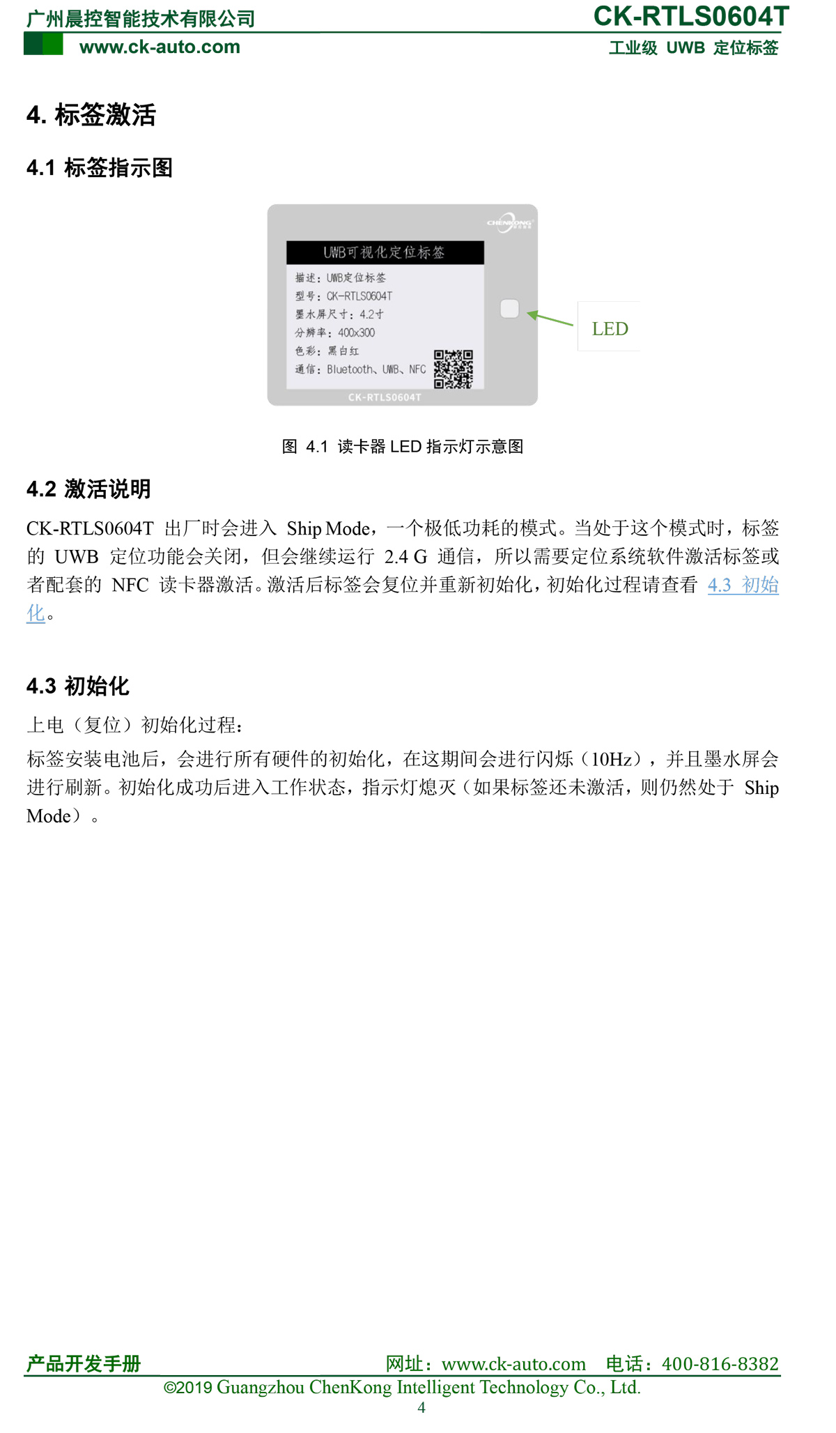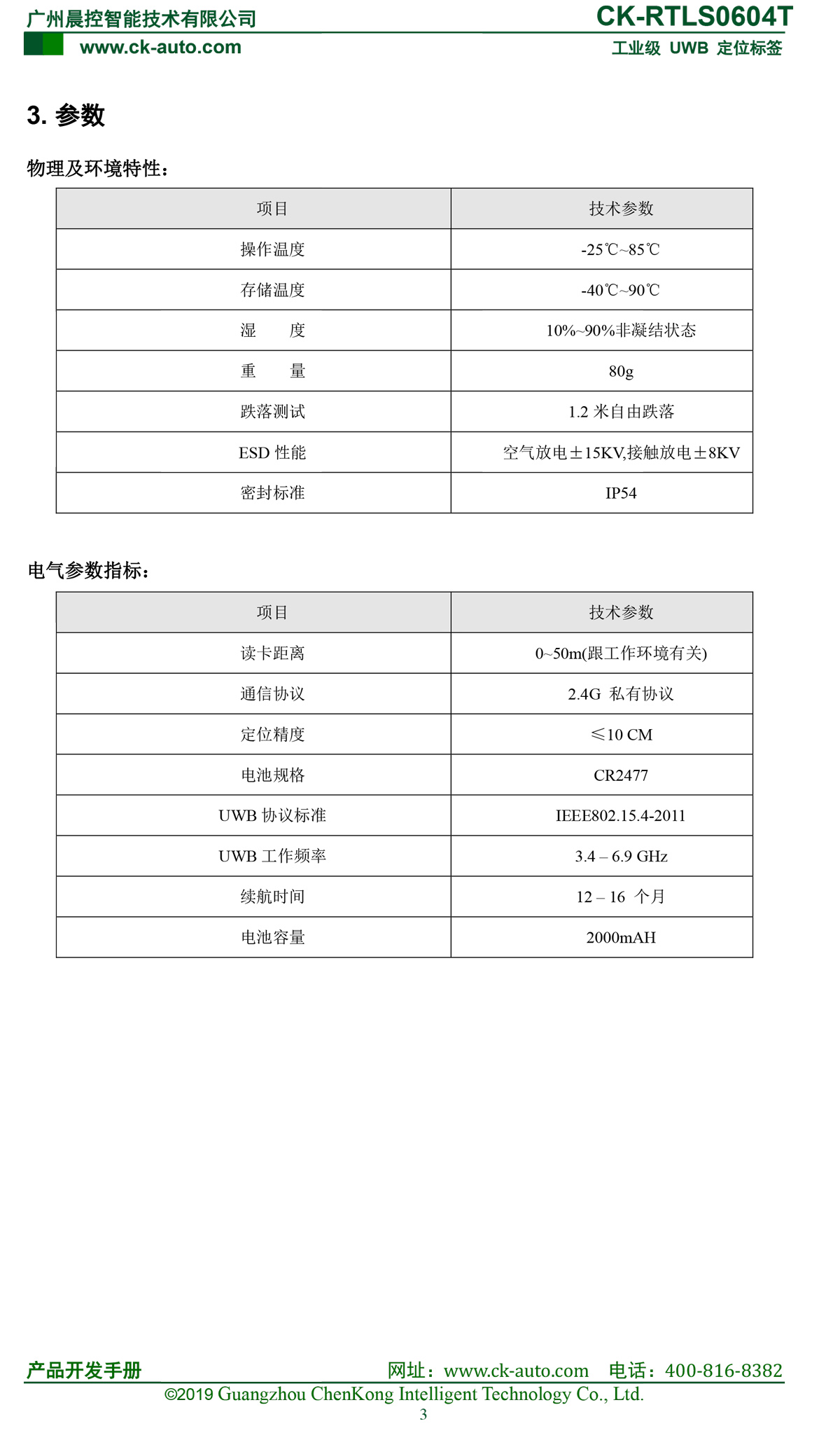 CK-RTLS0604T是一款基于无线载波通信技术的超高频RFID标签,标签工作频率为3.4–6.9GHz。内部集成了射频部分通信协议,用户只需上电,并且开启配套的定位系统即可进行定位管理。