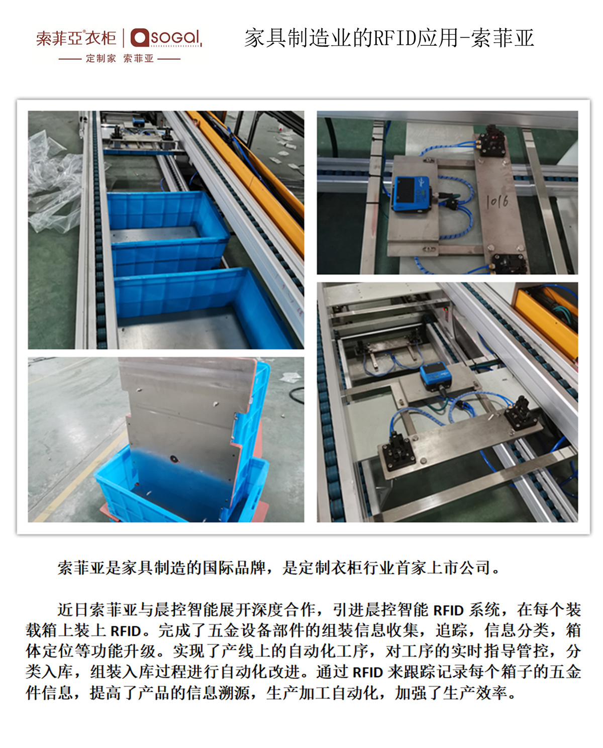 近日索菲亚与晨控智能展开深度合作,引进晨控智能RFID系统,在每个装载箱上装上RFID。完成了五金设备部件的组装信息收集,追踪,信息分类,箱体定位等功能升级。